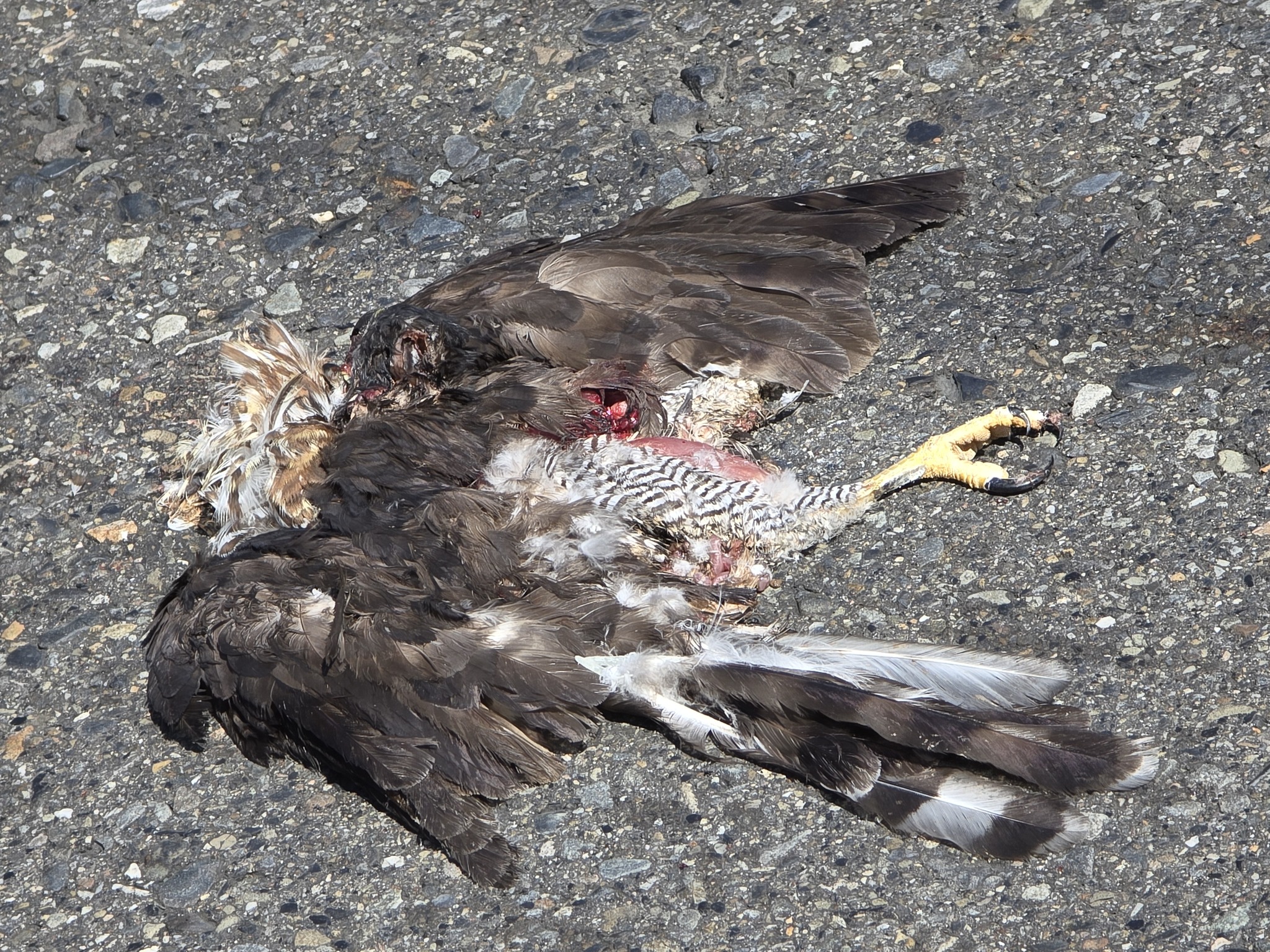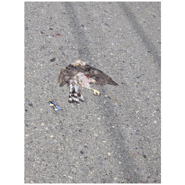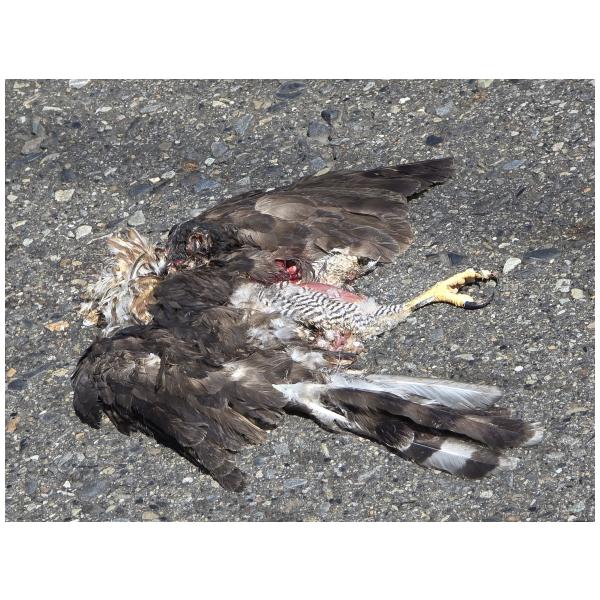 連假完全無預期下看到,真是難過。看來是早上才被撞,還很新鮮,這裡車多,被碾壓得嚴重,連要放比例尺,都等很久,大車小車呼嘯而過。猜想,可能下來抓掠物,太重,來不爬升飛翔。一次兩屍。及