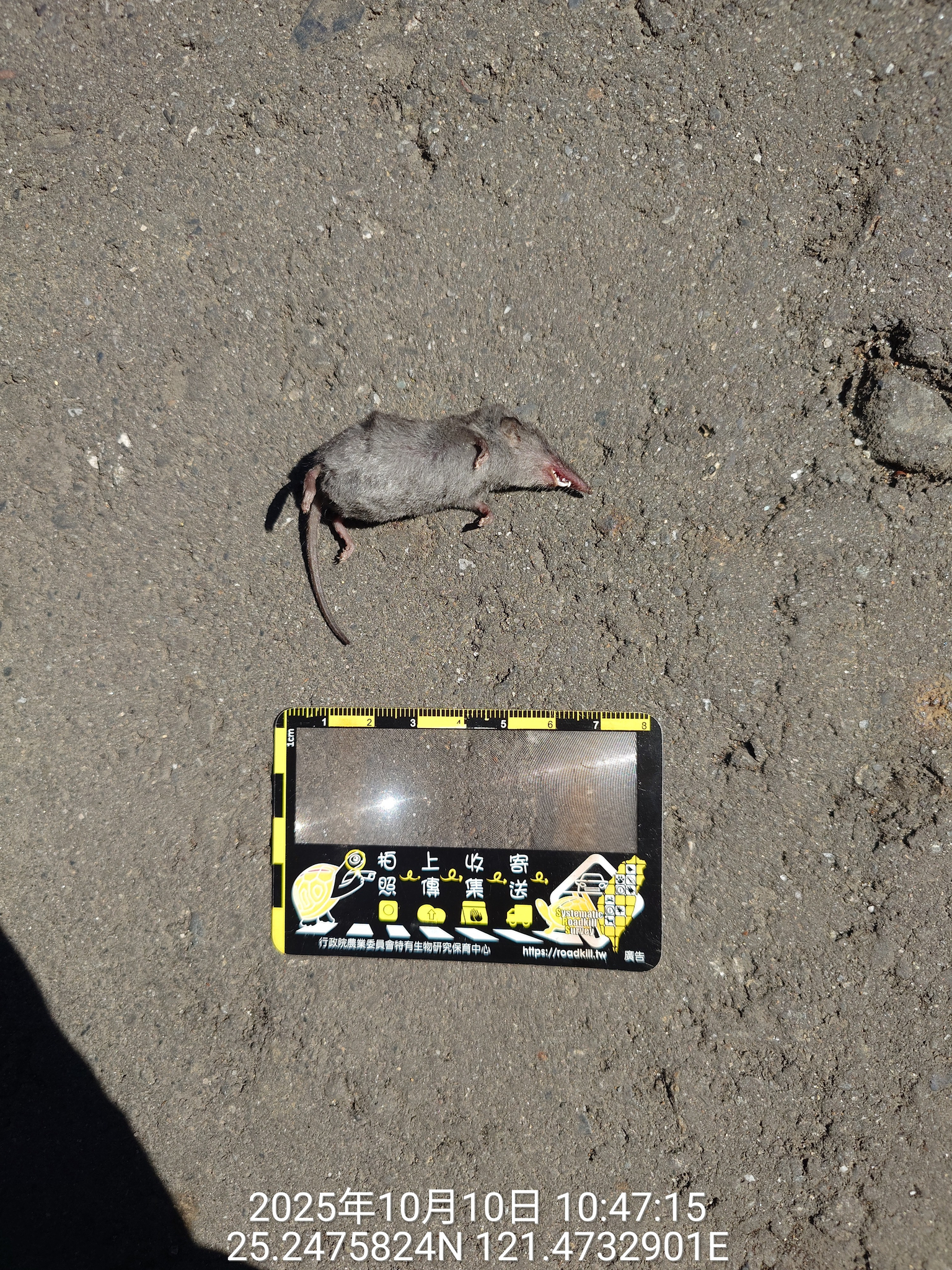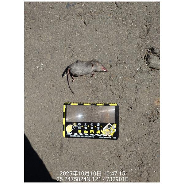 物種臭鼩 Suncus murinus (未鑑定)[原始紀錄物種] 臭鼩 Suncus murinus鑑定未鑑定敏感層級座標不開放紀錄時間2025-10-10 10:47地點記錄者邊緣人 (陳金棱)調查活動2025秋季(十月)系統化路死動物暨遊蕩犬貓數量調查: 調查活動 546414數量1 死因 路殺 類群 哺乳 標本未採集標本 補充說明 鑑定題庫授權照片授權: CC BY (陳金棱)識別號96b0d5ac-b068-4dae-8fa8-815992088653 (OccurrenceUUID)546417 (nid)