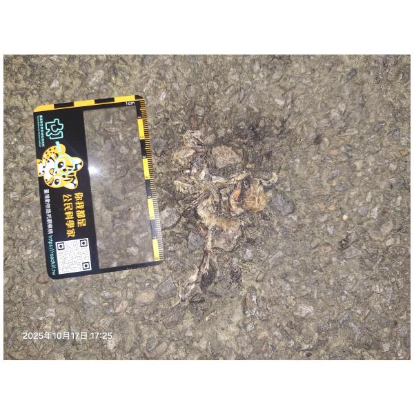 物種--- (未鑑定)[原始紀錄物種] 蛙鑑定未鑑定敏感層級座標不開放紀錄時間2025-10-17 17:25地點記錄者熊山寨工作隊 (熊出沒)調查活動2025秋季(十月)系統化路死動物暨遊蕩犬貓數量調查: 調查活動 547600數量2 死因 路殺 類群 兩生 標本未採集標本 補充說明 鑑定題庫授權照片授權: CC BY (熊出沒)識別號9f74d04d-cbe5-4c99-9ce7-803ca20f89a2 (OccurrenceUUID)547912 (nid)